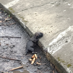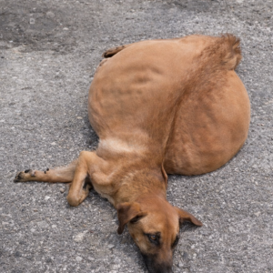 She was discarded among trash, weak and frightened, trying to move but unable to go far because her abdomen was dangerously swollen