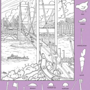 At first glance this detailed line drawing appears to be a simple cityscape. The massive structure of the Tsing Ma Bridge stretches across the frame while traffic…