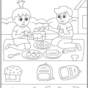 At first glance, this cheerful black and white illustration looks like a simple children’s coloring page. Two kids sit happily on a picnic blanket outdoors, enjoying snacks…