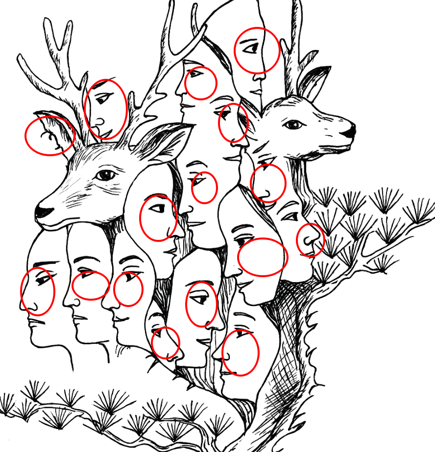 - The shape of the deer’s neck seamlessly transitions into lines that form human profiles