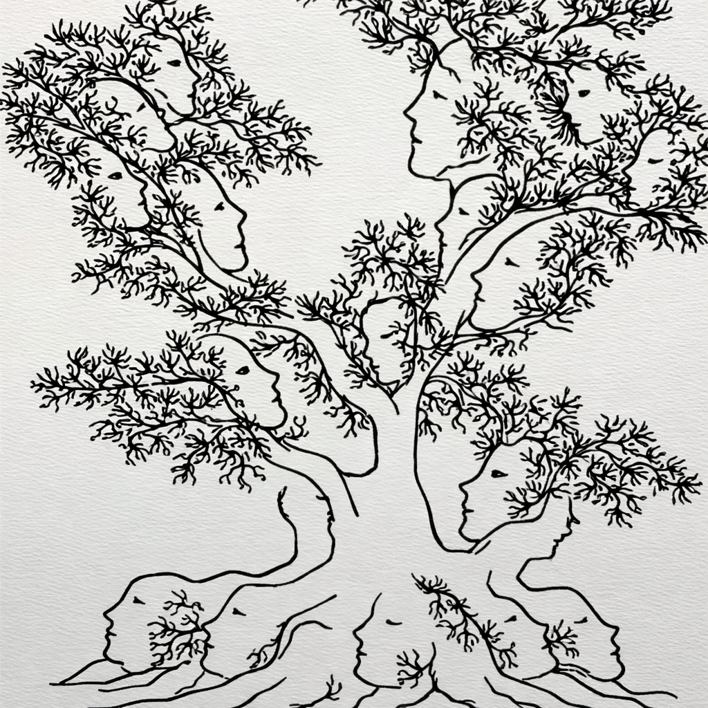 This artwork works like a quiet optical illusion. Your eyes first see branches. Then faces. Then more faces. Each profile feels distinct, yet they all grow from the same trunk. That moment of realization—when the image “clicks”—is incredibly satisfying.