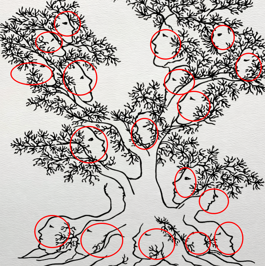 Despite its complexity, the image feels peaceful. The faces aren’t arguing. The branches don’t clash. Everything flows.