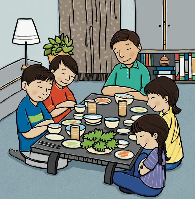 At first glance, the picture shows an ordinary dinner setting — five family members sitting around a traditional low table, eyes closed in prayer. Yet, what makes it extraordinary is the feeling it evokes. You can almost sense the warmth of the room, the aroma of freshly cooked food, and the peaceful silence before laughter and conversation fill the air.