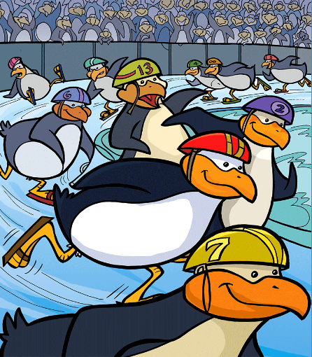 What makes this scene even more delightful is the sight of racing penguins wearing colorful helmets. Each penguin sports a different number, boldly printed on each helmet like professional athletes marking their territory. There’s: