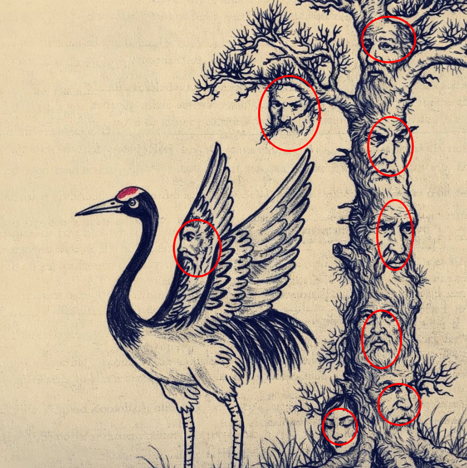 The Hidden Faces of Nature: Decoding the Symbolism in a Surreal Tree and Crane Illustration