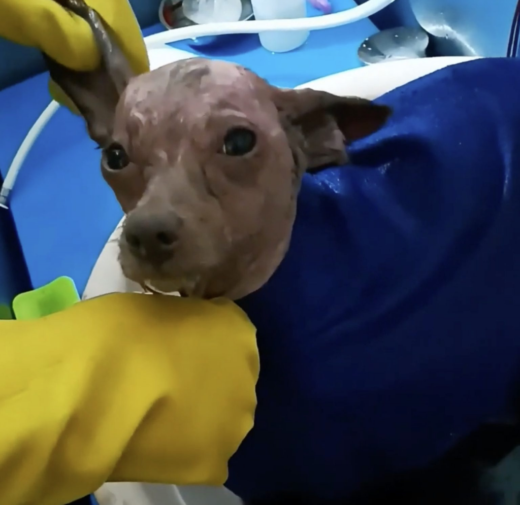 The dog needed both medical attention and gentle handling to avoid overwhelming his already fragile system. The first step involved giving him a warm medicated bath.