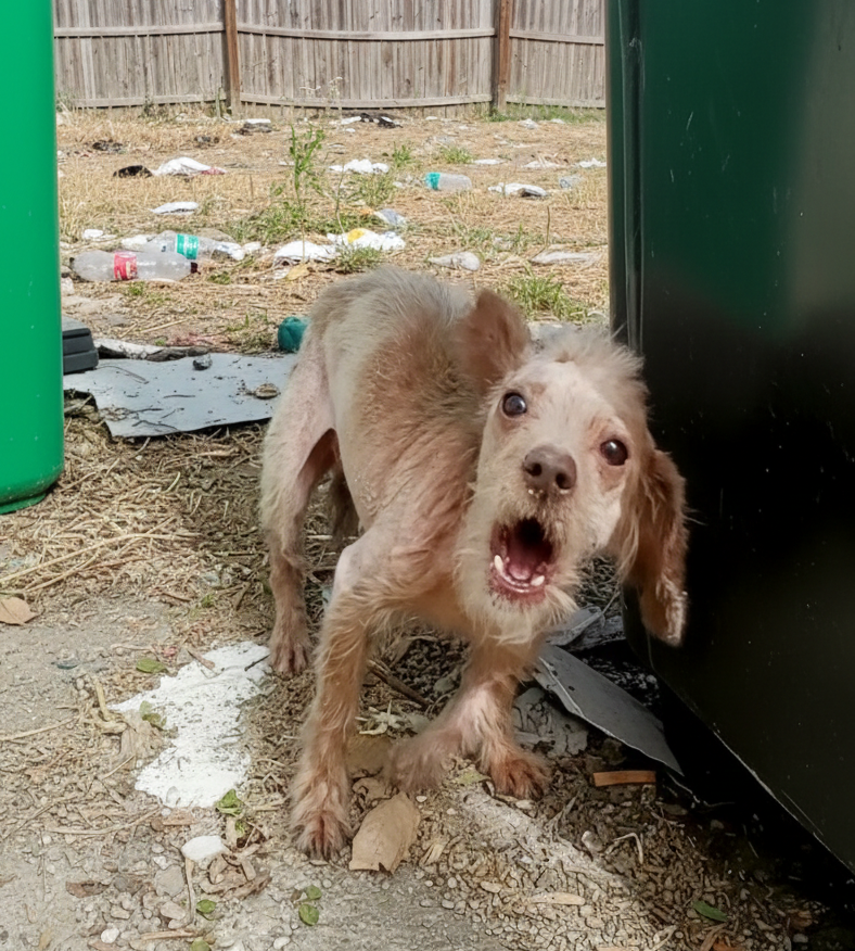 Near the trash bins, curled against the pavement, lay a dog so thin and still that he nearly blended into the surrounding debris. At first glance, it looked like he might already be gone.