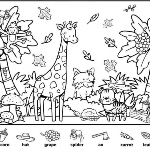 Find acorn, hat, grape, spider, ax, carrot and leaf.