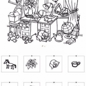 Find horse, flower, cat, cup, pen, teddy bear, ball, paper box.