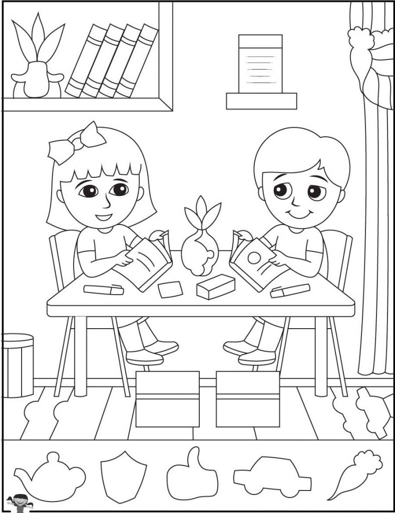 At first glance, this image feels calm and familiar. Two children sit at a table, books open, pencils nearby, a quiet room wrapped in soft lines and simple shapes. But look again and the scene shifts. This is not just a peaceful classroom moment. It is a hidden object puzzle designed to pull the viewer into active discovery.