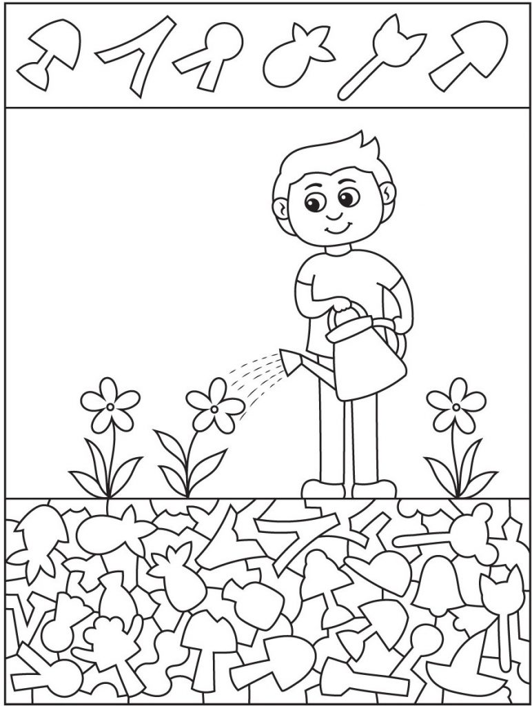 This cheerful garden illustration transforms a simple scene of a child watering flowers into a delightful hidden object challenge. While the peaceful garden captures attention at first, the real puzzle lies in the crowded shapes below.