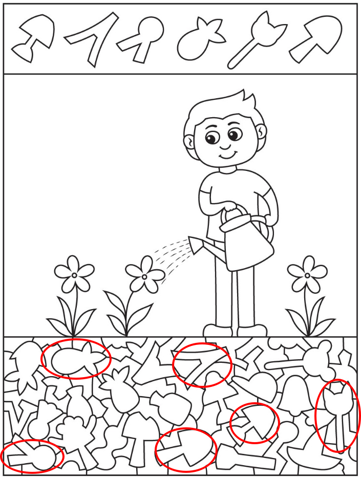 In this puzzle, your brain immediately identifies the boy, the watering can, and the flowers.