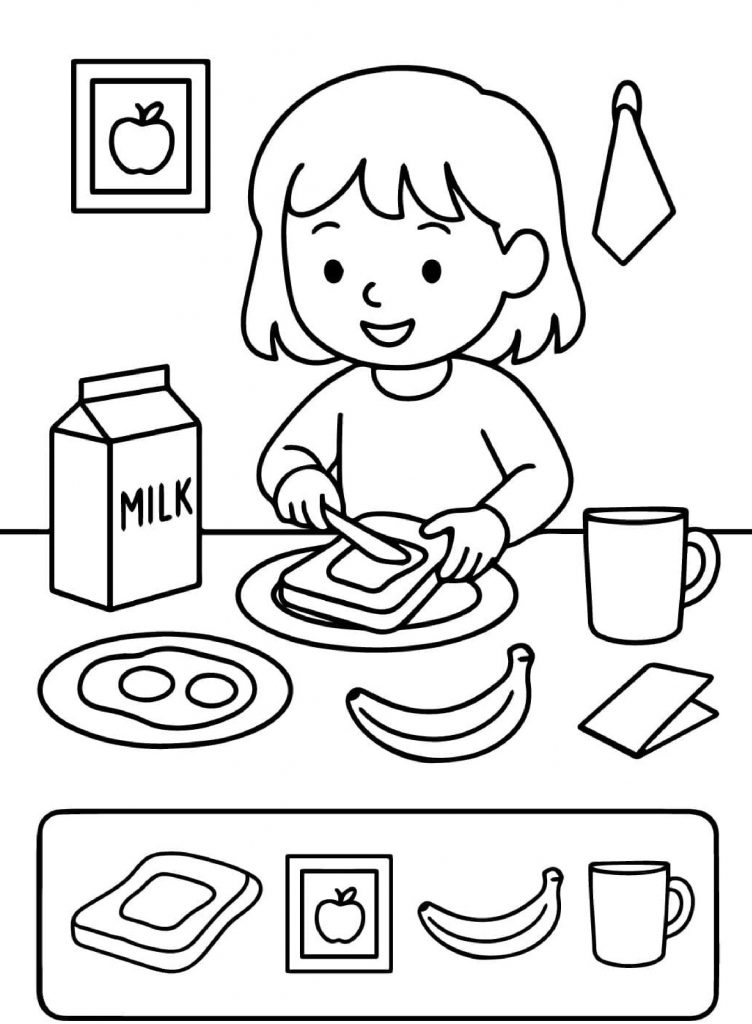 A positive morning routine sets the tone for the entire day—especially for children. And nothing captures this idea more charmingly than a simple, joyful illustration of a child preparing breakfast. In this delightful scene, a young girl spreads jam on toast as she sits at the table surrounded by classic breakfast favorites: milk, eggs, fruit, and a warm cup of morning comfort. It’s a moment full of innocence, nourishment, and the everyday magic of starting the day right.