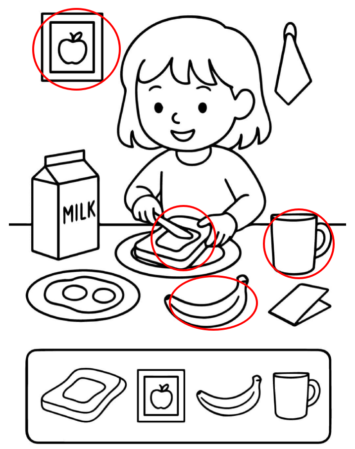 A simple framed apple on the wall symbolizes nourishment and learning. Apples often represent education and healthy choices—a perfect touch in a breakfast-themed illustration.