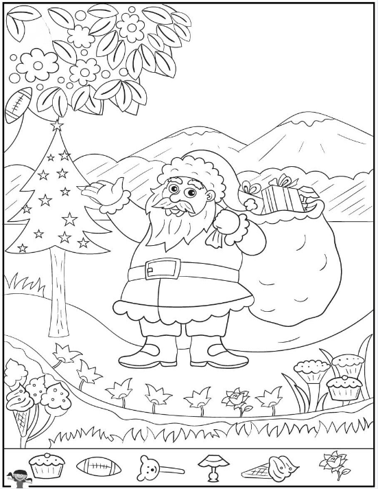 Behind him, snow-capped mountains stretch across the horizon, hinting that this festive scene might be unfolding somewhere close to the North Pole. A decorated Christmas tree sparkles nearby, its ornaments glowing with stars, as if reflecting Santa’s own joy. Even the flowers and cupcakes at his feet seem to celebrate, bursting with holiday cheer.