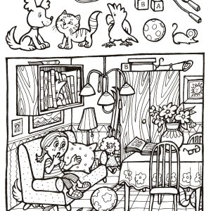 Find dog, cat, parrot, ball, rat, letter cubes and jump rope.