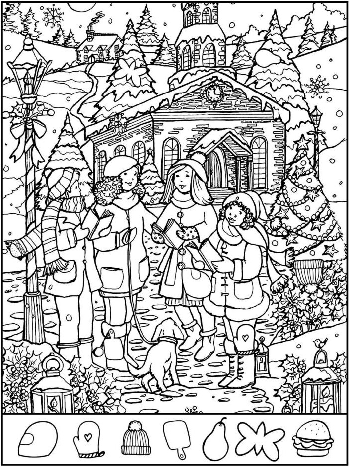 In this picture, the carolers stand before a beautifully decorated church — its steeple crowned with snow and its windows glowing softly from within. Around them, trees sparkle with ornaments and ribbons, while a small dog looks up curiously as if enjoying the song.