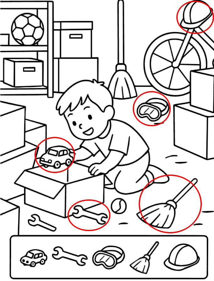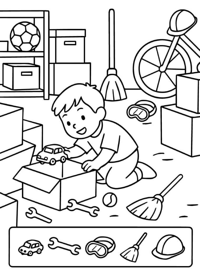 Think about it: he’s organizing boxes, inspecting old items, and deciding what to do next — actions that teach responsibility and curiosity. Even the small tools and objects scattered on the floor invite experimentation. Maybe he’ll try to fix something, or maybe he’ll invent a story about how the toy car got there.