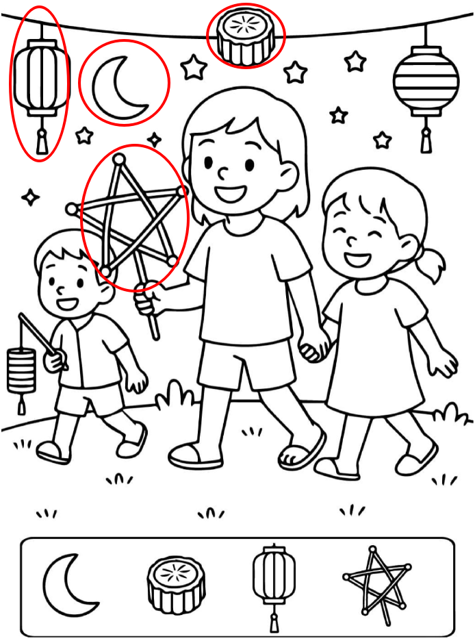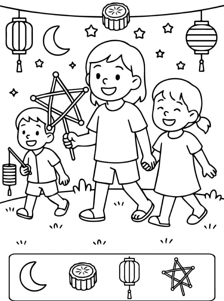 The picture perfectly portrays a heartwarming festival evening. The moon shines brightly, stars twinkle overhead, and colorful lanterns sway gently in the breeze. The children’s faces glow with excitement as they hold their lanterns — one shaped like a star, another like a traditional round lantern — symbolizing hope and happiness.