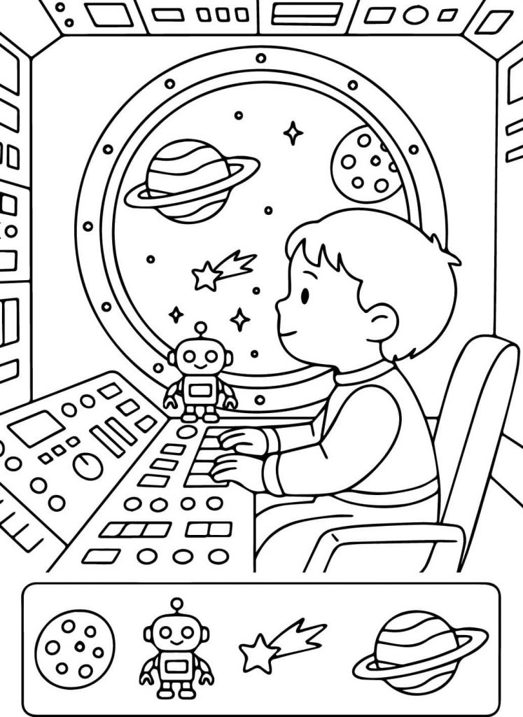 Imagine sitting inside a sleek spaceship, surrounded by glowing buttons and high-tech panels, staring out into the infinite beauty of space. Planets float in the distance, a shooting star streaks across the sky, and a tiny robot companion keeps you company. That’s exactly what this picture captures — the wonder of a child’s imagination taking flight among the stars.