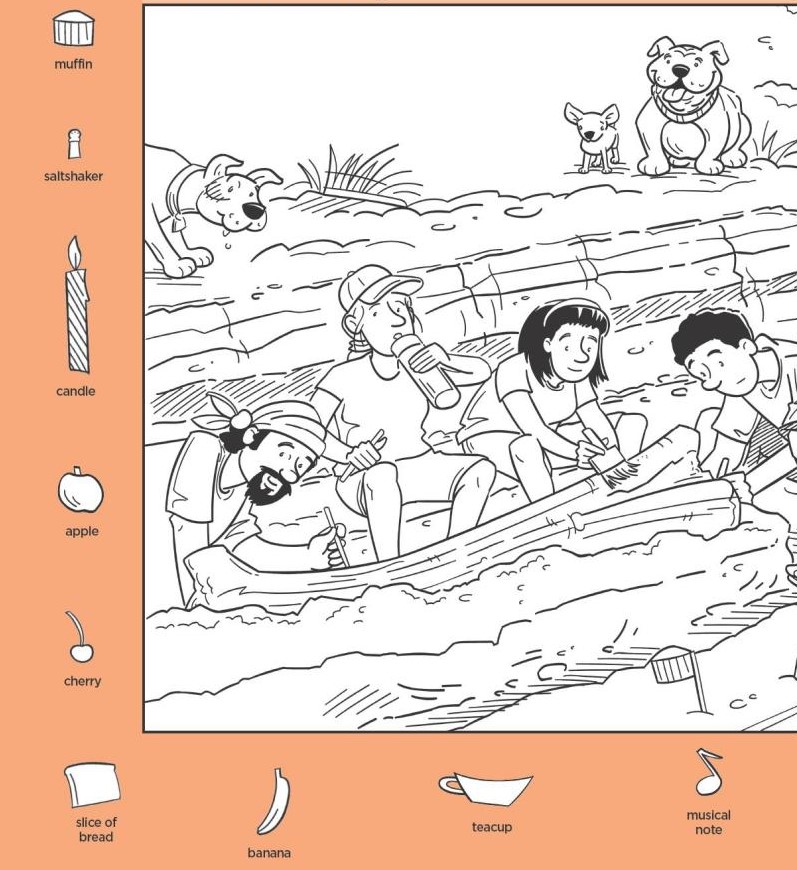 This puzzle uses that effect beautifully. The flowing water encourages scanning. The layered rocks create natural hiding places. The characters draw your eyes in different directions.