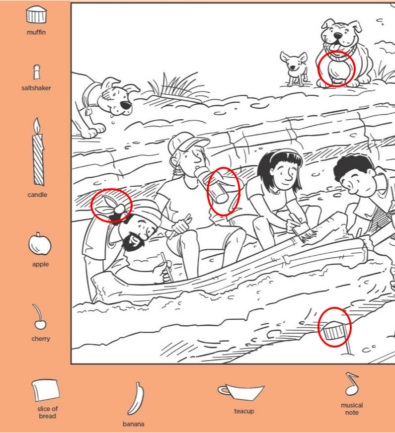 Without color cues your brain must rely entirely on form and spacing. Objects blend into the environment more easily. A slice of bread might echo a rock shape. A musical note might hide in water lines.
