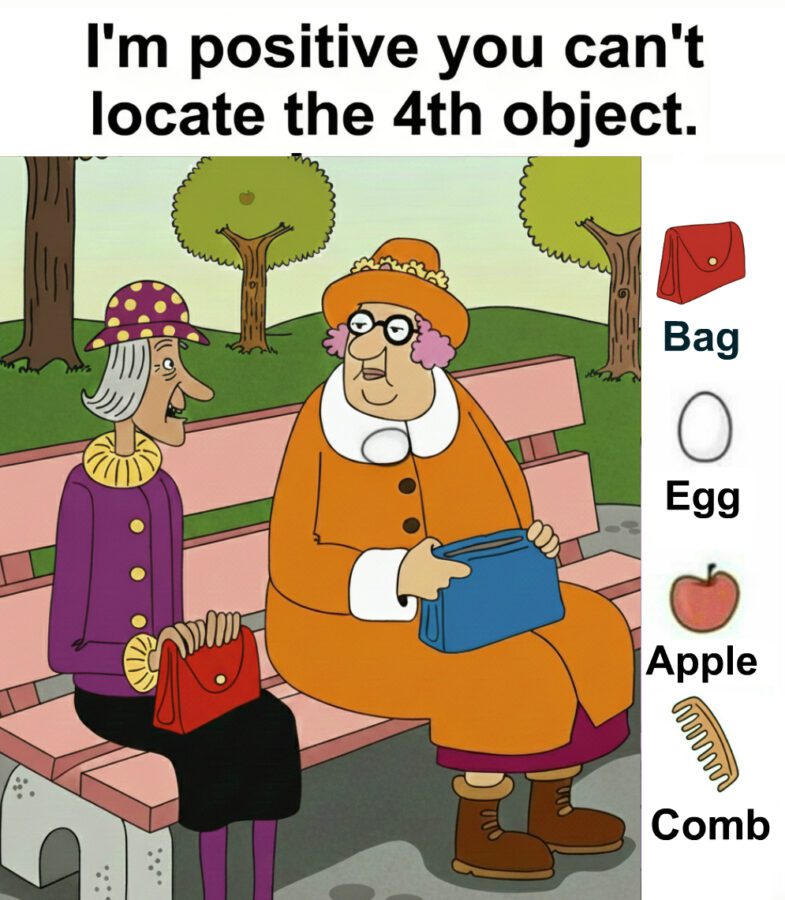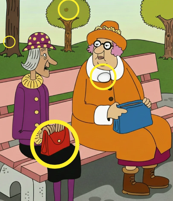 At first glance this image feels calm almost cozy. Two elderly women sit on a park bench enjoying a quiet moment under green trees. The colors feel soft. The expressions feel relaxed. Nothing looks rushed. But then the challenge hits you right between the eyes. I am positive you can not locate the fourth object.