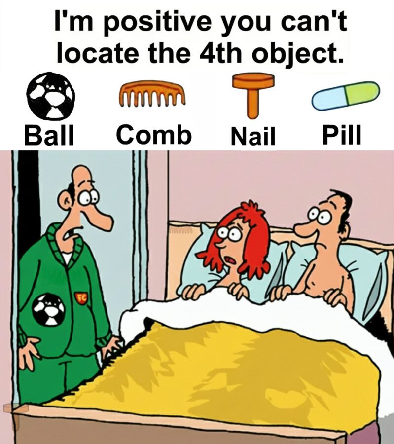 At the top, the challenge feels bold and playful: “I’m positive you can’t locate the 4th object.” And just like that, your curiosity is hooked. Four objects are listed—ball, comb, nail, and pill—and your brain instantly accepts the challenge. Easy, right? Or so you think.