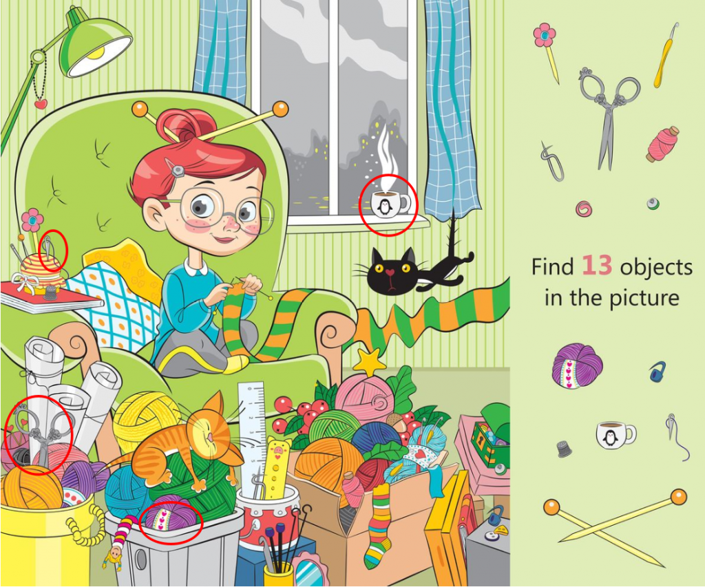 This illustration feels like a warm cup of tea on a rainy afternoon. One look and you instantly sense comfort creativity and quiet joy. A young girl sits curled up in a soft green armchair knitting calmly while the room around her overflows with colorful yarn playful details and clever hidden objects. It is not just a cute picture. It is a thoughtfully designed visual puzzle that invites the viewer to slow down observe closely and enjoy every tiny detail.