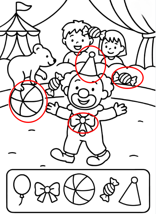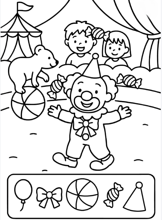 In this circus scene, the shapes are not hidden in dark corners or disguised beyond recognition. Instead, they blend naturally into the artwork. A balloon may resemble part of the background design. A beach ball might mirror the bear’s balancing ball. A party hat could echo the clown’s hat shape.