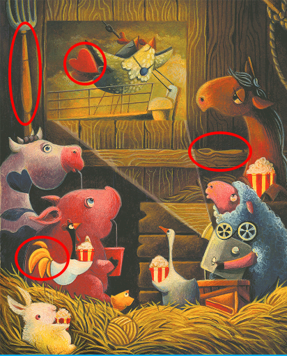 Instead of people, we see animals. A pig, a cow, a goose, a rooster, and even a curious mouse sit together like old friends, sharing a moment of wonder. On the screen within the scene, more animals appear, deepening the sense of story within a story.