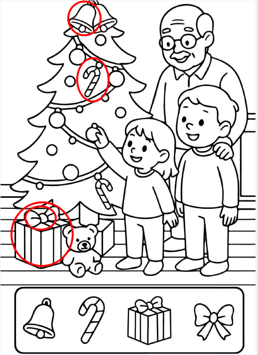 This hidden object Christmas puzzle transforms a warm family scene into an engaging mental experience that appeals to all ages. By combining festive storytelling clean line art and a clear visual challenge it invites viewers to slow down focus and enjoy the moment. Whether used as a holiday activity for kids a calming exercise for adults or a shared family game this image proves that the simplest puzzles often create the most meaningful moments.