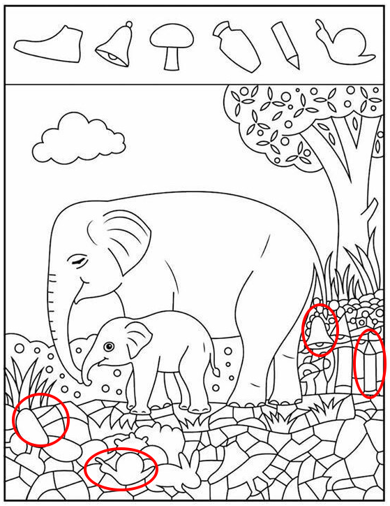 A row of small shapes waits at the top of the page, inviting you to find them hidden within the scene below. A shoe. A bell. A mushroom. A bottle. A pencil. A snail. What seemed like a simple wildlife illustration now becomes a thoughtful hidden picture puzzle that rewards careful looking and steady focus.