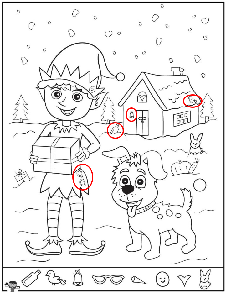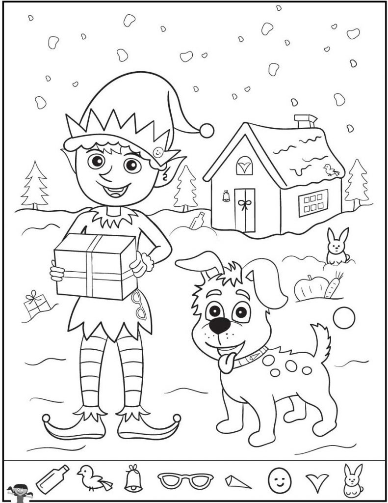 There’s something timeless about Christmas illustrations. Snow falling softly, cozy houses, cheerful characters, and just enough mystery to spark curiosity. This elf-and-puppy hidden object picture is a perfect example. At first glance, it looks like a sweet winter coloring page. Look again, and it quietly transforms into a clever puzzle that invites kids to slow down, observe, and think.