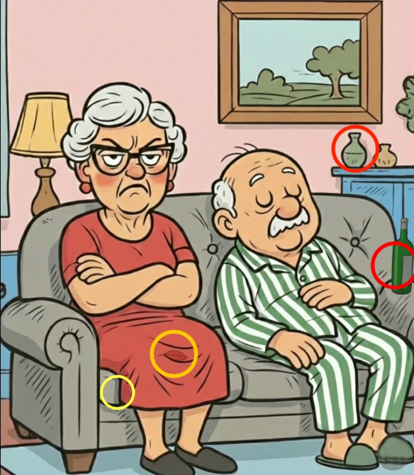 At first glance, the image above looks like an ordinary moment inside a quiet living room. An elderly couple sits together on a couch. The man appears to have dozed off, leaning comfortably in striped pajamas. Next to him sits an older woman with her arms crossed and a stern expression. A lamp glows beside them, a painting hangs on the wall, and a small cabinet with decorative items completes the cozy environment.