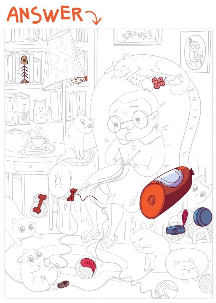 A grandmother. A chair. Yarn on the floor. Cats everywhere. And ten tiny objects waiting to be found.