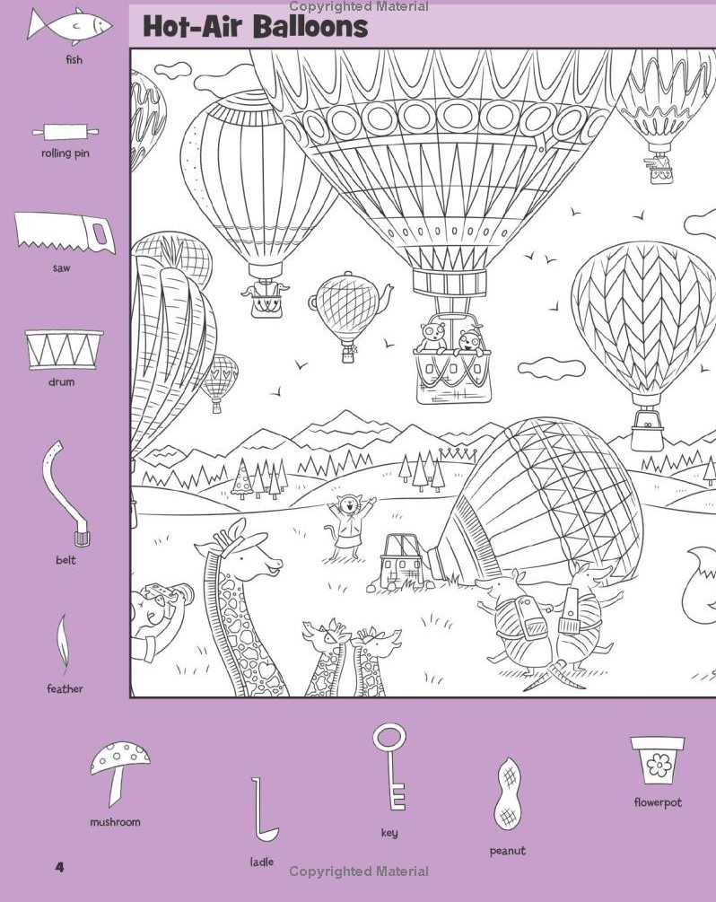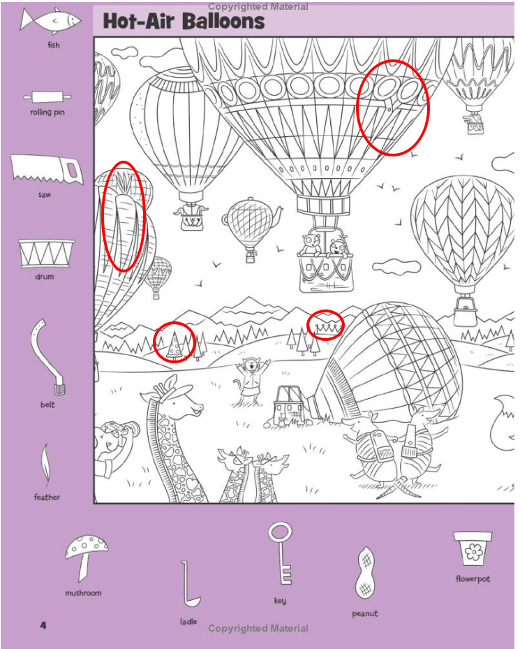 A peanut shape might hide within the curve of a cloud. A flowerpot might merge with the basket of a balloon. A ladle could disguise itself among ropes or curved edges.