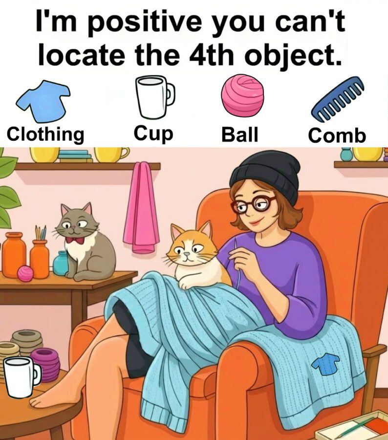 This cozy knitting and cats hidden object puzzle shows how powerful subtle design can be. By using warmth, familiarity, and visual harmony, it turns a peaceful scene into a clever mental challenge. The objects do not hide through chaos but through comfort, expectation, and misdirection. Finding the fourth object feels satisfying because it forces you to slow down and truly look. This puzzle is not about speed or intelligence. It is about attention. And once you crack it, you realize the trick was never the image. It was your own assumptions.