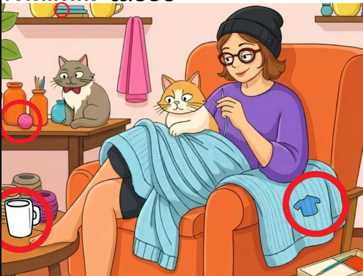 At first glance, this image feels like comfort wrapped in color. A woman relaxes in a warm chair, knitting peacefully while two curious cats keep her company. Yarn sits neatly nearby. Shelves glow with soft tones. Everything feels calm, familiar, and safe. Then your eyes land on the challenge at the top.