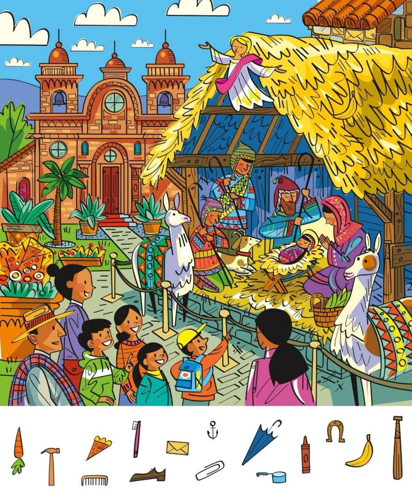 At first glance, this image feels warm, joyful, and familiar. You see a colorful nativity scene filled with people, animals, and a peaceful sense of celebration. Children smile. Llamas stand proudly. An angel spreads golden wings above a humble stable. It looks like a beautiful illustration straight out of a storybook. But pause for a moment and look again. This is not just a festive scene. It is a cleverly designed hidden object puzzle that challenges your focus, patience, and observation skills in the most delightful way.