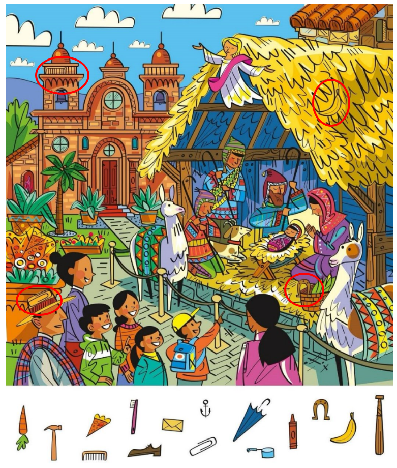 The list of hidden objects includes items you would never expect to find in a nativity scene. A pizza slice. A toothbrush. A paperclip. A banana. An umbrella.