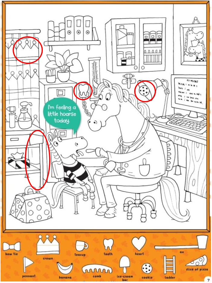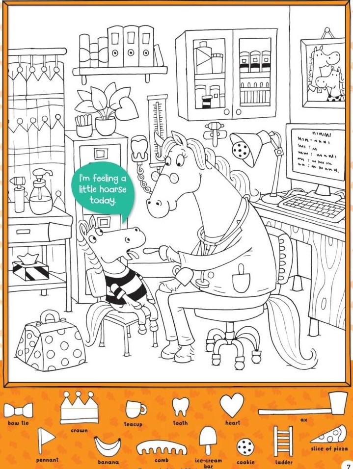 The list of hidden objects reads like a mix of silly and ordinary. A banana next to a tooth. A crown near a comb. A slice of pizza hiding in a medical office.