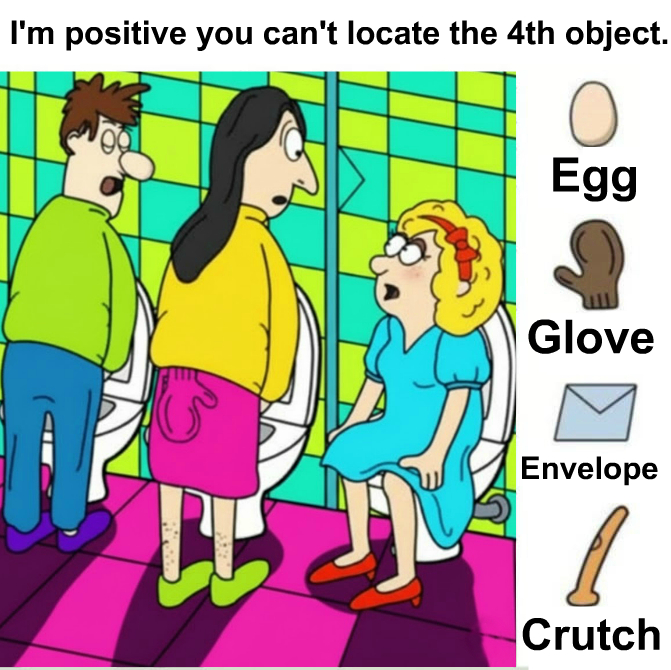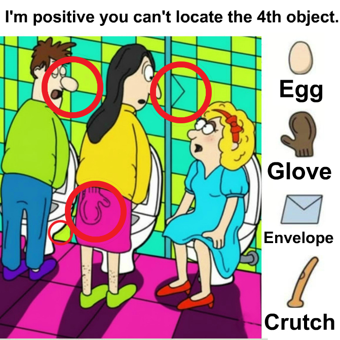 You scan faces. You scan clothes. You inspect the background tiles, the floor, the toilet shapes. You spot one object easily. Then another. Your confidence grows — until it suddenly drops.