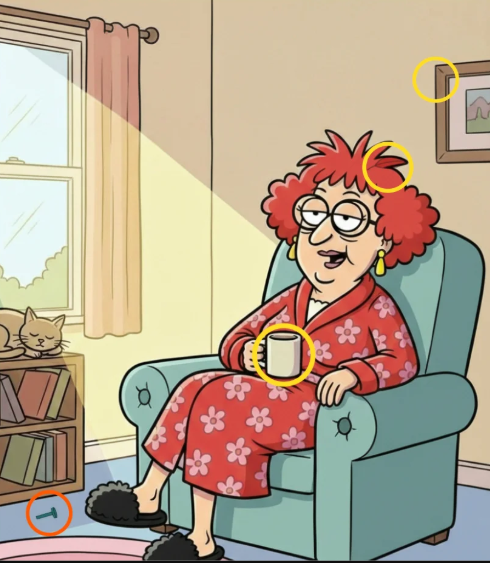That single sentence turns a simple cartoon into a full-blown challenge. The image shows a cozy living room scene: an older woman with bright red hair sits comfortably in an armchair, sipping from a cup of coffee. Sunlight streams through the window. A cat naps peacefully on a shelf. Everything looks calm, warm, and ordinary.