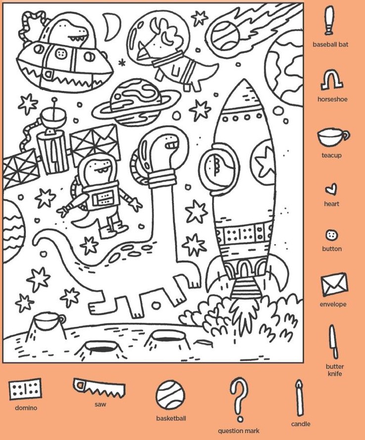 The hidden objects listed around the border encourage close observation. Shapes like a teacup button heart or envelope blend naturally into the space environment. They do not feel forced. They feel clever.