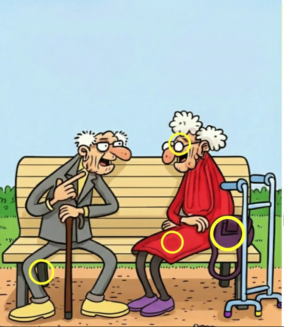 At first glance, this cartoon scene feels peaceful and ordinary. An elderly man and woman sit on a wooden park bench, deep in conversation. The man leans on his cane, slightly animated as he speaks. The woman listens quietly, her purple bag resting beside her walker. The sky is clear. The grass is calm. Nothing looks complicated.