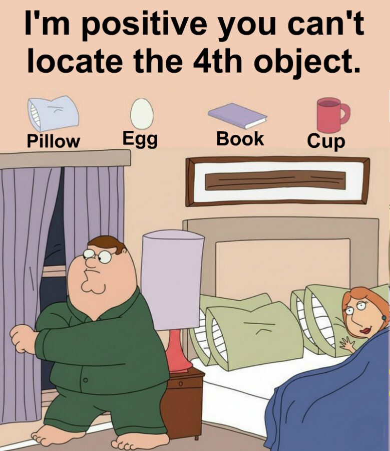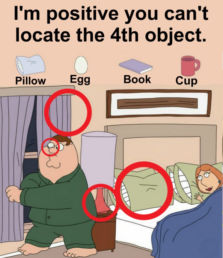 A pillow on a bed feels invisible because it belongs there. A cup on a nightstand feels natural. An egg feels out of place but your brain does not expect it so it misses it.