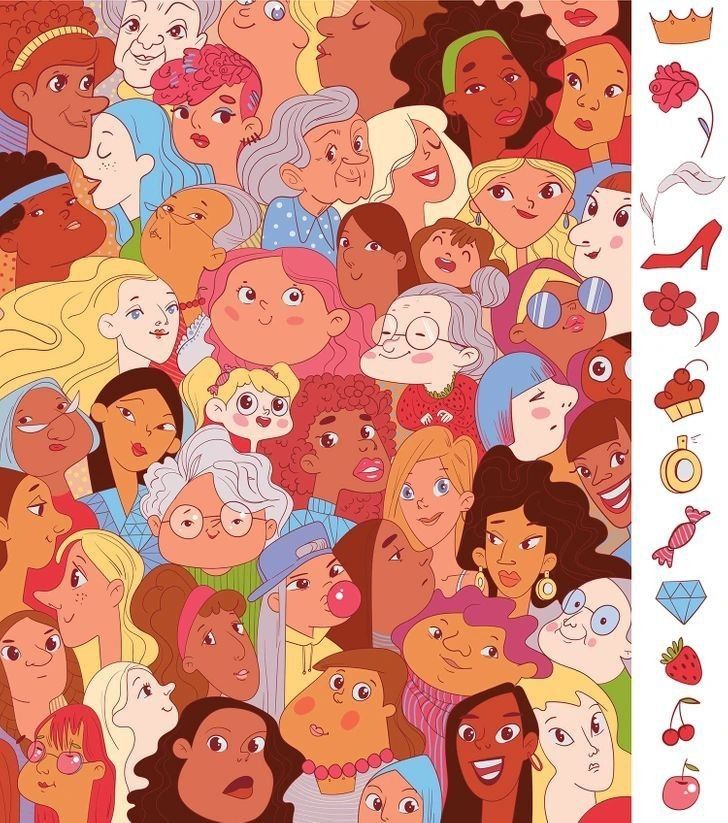 By blending a vibrant celebration of women’s faces with cleverly concealed everyday objects, the illustration transforms into an interactive challenge. It invites viewers to slow down, observe carefully, and enjoy the thrill of discovery.
