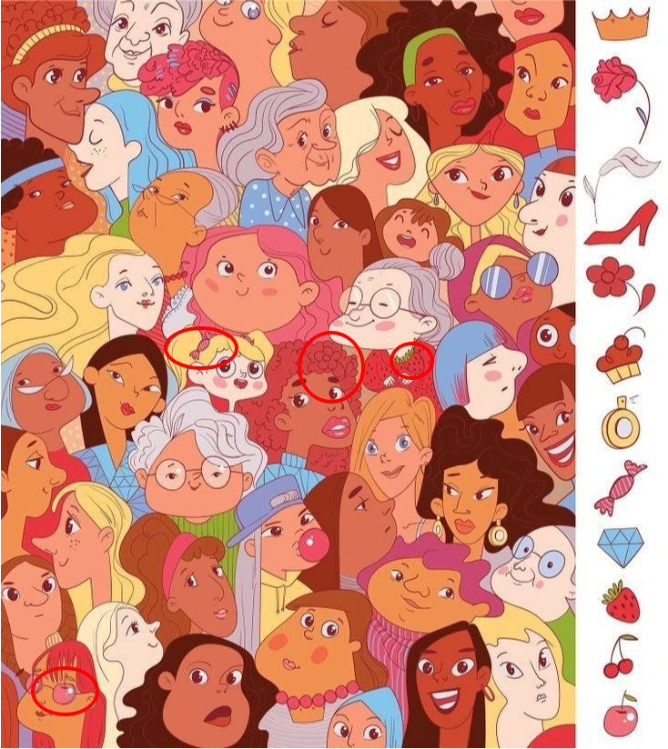 Because you focus on recognizing faces, you may overlook small embedded shapes. A diamond might blend into a necklace highlight. A strawberry could hide in a cluster of curls. A ring might merge with a circular earring. A cupcake shape might disguise itself in a hairstyle.