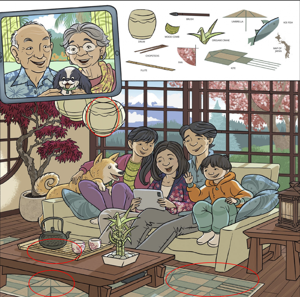 The setting of the room itself tells a deeper story. Traditional elements — like the tea set, bonsai plant, and wooden décor — beautifully blend with modern touches such as the tablet and comfortable furniture. This harmony between old and new represents the evolving nature of family life.